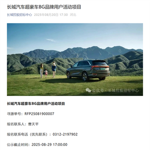 日前,车质网从相关渠道获悉,长城控股招标中心今日发布“长城汽车超豪车BG品牌用户活动项目”,长城表示,现面向全球公关招募具备超豪品牌服务经验与卓越社交媒体运营能力的供应商,服务长城汽车超豪车BG,协助用户活动的规划和执行。