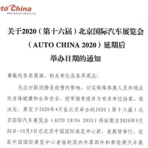 为应对新冠肺炎疫情的影响,切实保障参展人员和观众的身体健康和生命安全,经审慎考虑并与有关单位协商,现决定,原定于2020年4月在北京举办的2020(第十六届)北京国际汽车展览会(AUTO CHINA 2020)将延期至2020年9月26日-10月5日在北京中国国际展览中心新、老展馆举行,设在中国国际展览中心老馆的国内外零部件和新能源汽车展区的举办时间是2020年9月28日-9月30日。