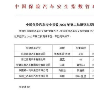 近日,中国保险汽车安全指数管理中心(下简称中保研C-IASI)公布了2020年第二批碰撞测试车,分别是梅赛德斯-奔驰 A级、领克03、江淮嘉悦A5、马自达阿特兹、丰田RAV4荣放 (配置|询价)共5款车型。
