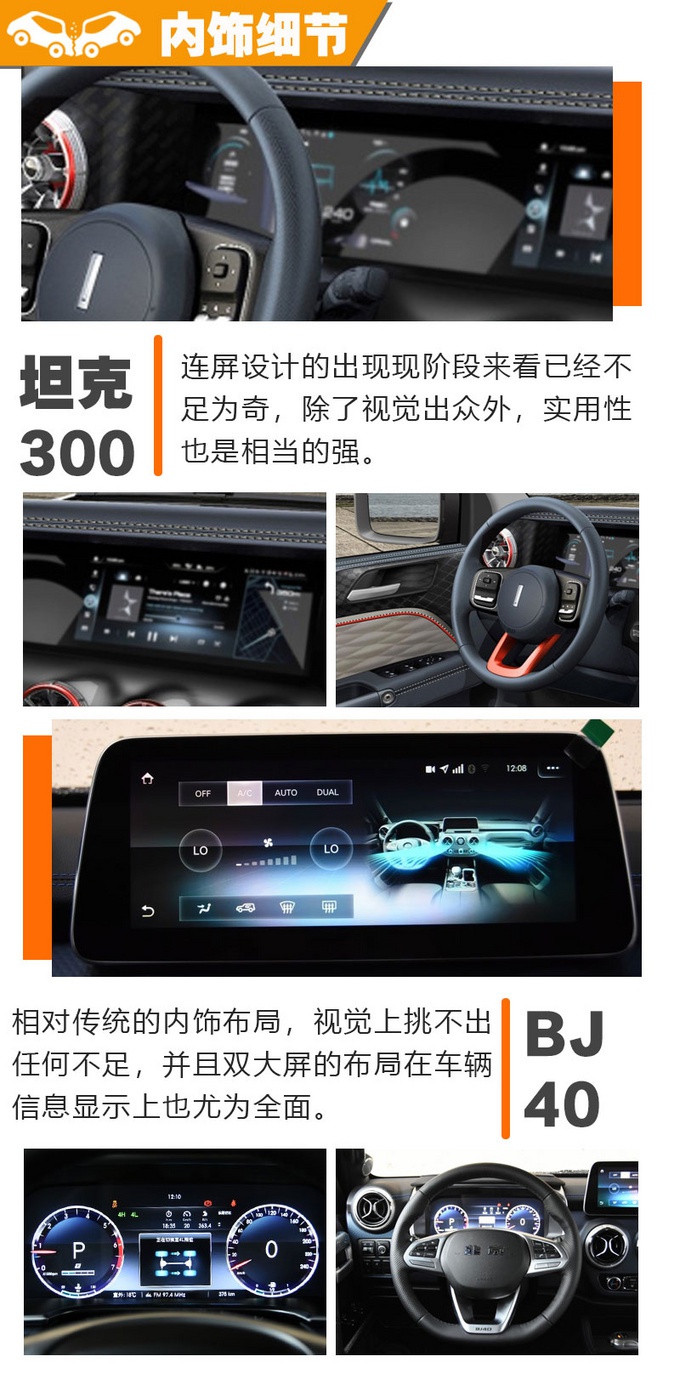 WEY品牌车型的内饰,相信各位早有领略,进入车内可以说是满眼高级感,也符合其自主豪华品牌定位,通过现阶段曝光的官图也可以看到坦克300亦是如此,不论设计、用料还是配色都将豪华进行了全面的诠释。配置的话,相信一定会被武装到牙齿。BJ40内饰布局虽相对传统一些,看得出是实用主义,但主流的配置还是样样俱全,在用车体验方面绝无可挑,毕竟也要为其“城市猎人版”的称谓负责。