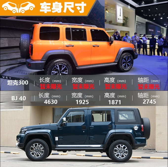 实际上,两款车在外观部分还是有着一定的相似之处,最为明显的当属方正的造型,不同的是坦克300更倾向于复古车型的气息,而BJ40则是彻头彻尾的硬派,处处见方。细节处,由于坦克300暂未公布配置情况,我们通过外观硬件配置可以得知其带有全景影像功能、前后驻车雷达、无钥匙进入等主流的配置,BJ40同样也是如此,不过要来到高配车型才可。在车身尺寸方面,坦克300暂未公布,但通过实车来看,视觉上相比BJ40要稍大一些,但都为紧凑型SUV定位。