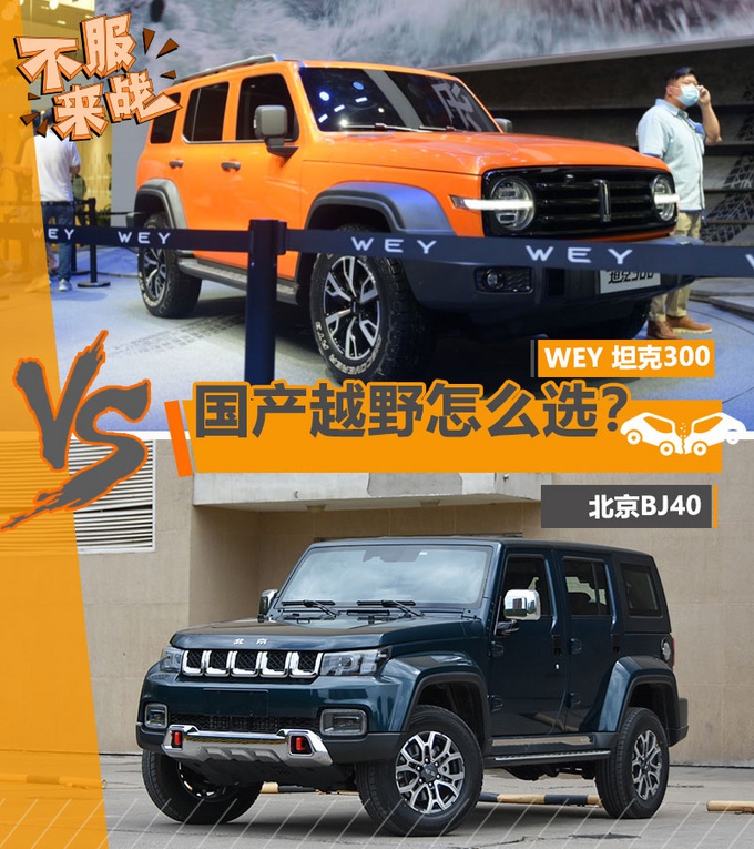 说到硬派越野车,相信很多消费者都会第一时间想到Jeep牧马人、丰田普拉多等一系列脍炙人口且经典的车型。不过随着自主品牌车企的技术实力逐渐提升,完全自主研发的精品硬派越野车型也逐步走向市场,最为典型的莫过于北京BJ40 (配置|询价)系列,凭借不错的性能和亲民的售价,让其深受越野迷追捧。另一方面,作为豪华品牌的WEY,在前不久也推出了一款硬派越野车WEY坦克300 (配置|询价),性能与豪华兼备。那么,这两款车谁更值得选择呢?