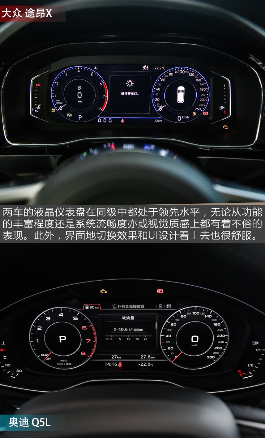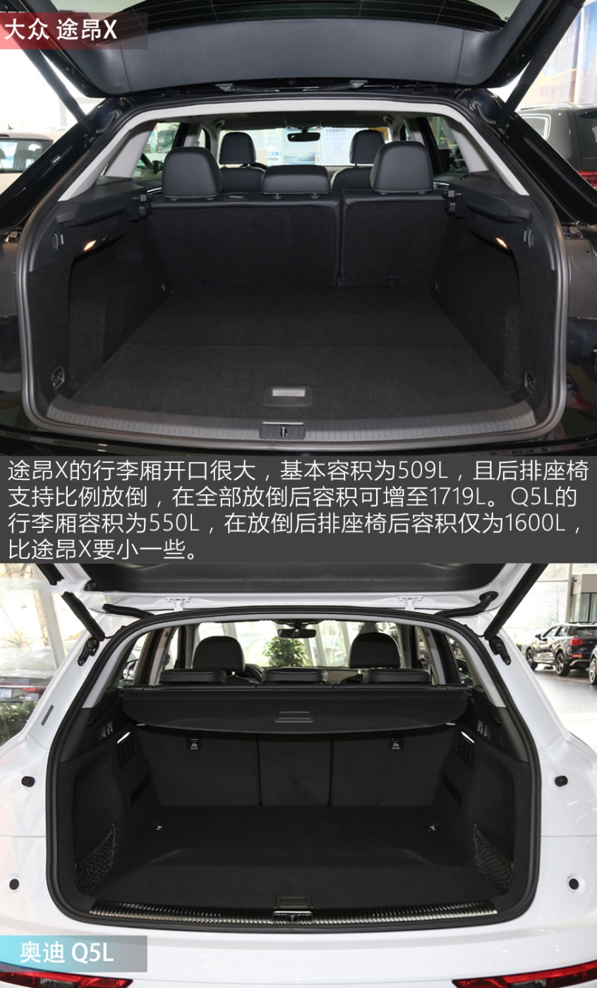 编辑点评:通过以上四回合精彩的攻守擂台赛,我们可以看到本次的参赛选手途昂X在比奥迪Q5L售价便宜6万多元的情况下,在外观/内饰质感、多媒体系统、舒适性配置和动力系统等方面却都占有优势。尤其是动力和配置上,途昂X配合终端优惠,已经可以用30万出头的预算买到一款2.0T 高功率发动机的顶配版本车型了,这在同级别中几乎是不可能的。当然了,Q5L在品牌的豪华程度上确实要强一些,勉强搬回了一城,不过各配置车型的价格普遍要比途昂X贵大几万元不等,这些多花的钱完全可以看作是为了单纯的品牌而买单。买车究竟是给自己用还是给别人看,我相信广大消费者心中已有答案。