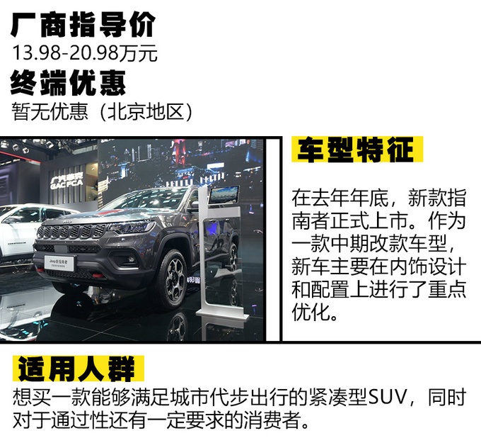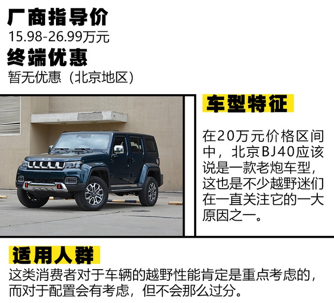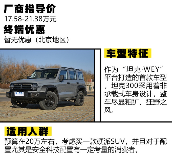 最后,咱们来总结下,在上述推荐的三款车型中,坦克300和北京BJ40非常适合于一些越野发烧友类玩家去考虑。而指南者与这两者相比,要显得比较均衡,在通过性不错的情况下,也更适宜日常代步出行所需。因此,如果你有着为20万左右的购车预算,正考虑买一款很有阳刚格调的车型,不妨多看看这三款。