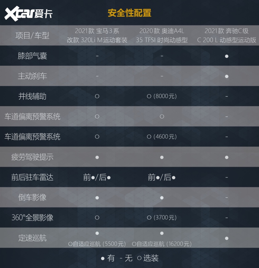 安全配置方面,C级入门版比另外两车多出了膝部气囊和主动刹车系统。像并线辅助、车道偏离预警、车道保持辅助等辅助驾驶功能,是这3辆车都不具备的,但3系和A4L入门版支持官方选装,C级入门版则连选装的机会都没有。另外,3系和A4L入门版标配前/后驻车雷达和倒车影像,360°全景影像则需要进行选装,而C级入门版则是通通都没有的。定速巡航功能则是3车都有配备的,3系和A4L的入门版本还支持选装升级为自适应巡航。