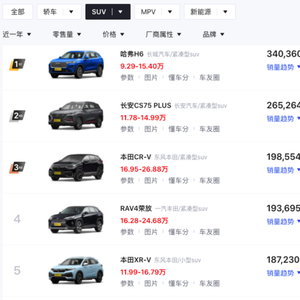 回顾2021年全年的SUV销量榜,哈弗H6、长安CS75 PLUS、RAV4荣放 (配置|询价)、XR-V、途观L这些车型都是名列前茅,月均销量都在1.5万辆以上,就去问这些车。