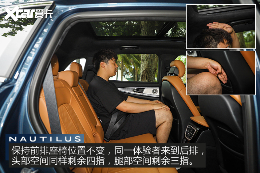 前排为体验者坐姿,此时后排可获得一拳的头部空间,以及一拳左右的膝部空间。
