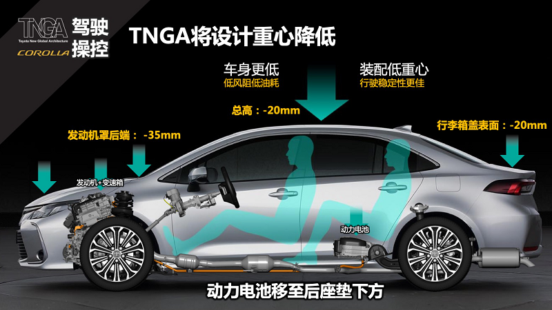 全新一代卡罗拉得益于TNGA架构,在底盘方面也得到优化,发动机、电池进行降低、重心降低、车身总高度降低20cm。另外,车身和底盘都是用了高强度材料,保证车辆刚性和安全。悬挂上采用前麦弗逊式独立悬架,后悬挂变为双叉臂式独立悬架,这一点还是不错的,提高了整车操控性。