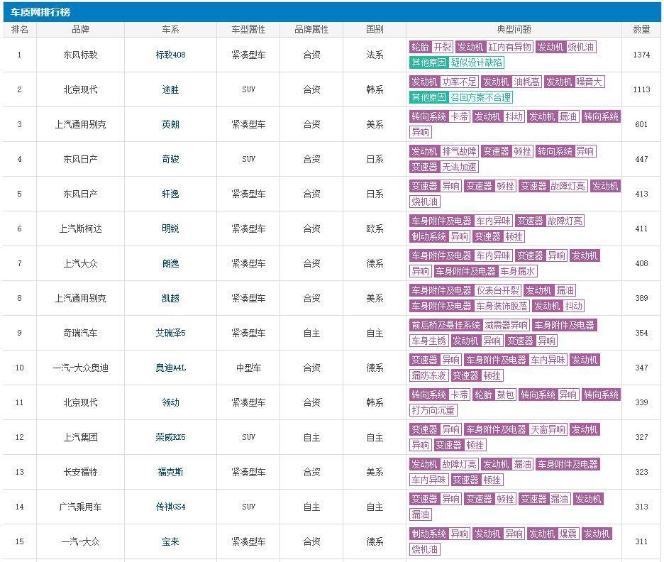 每到半年这个时间节点,汽车行业的盘点数据也就相继来了,产销数据、质量数据、投诉数据等等,我们近日,国内某知名汽车网站车质网公布了最新的国内投诉量数据,通过该网站统计数据显示,2019年上半年汽车投诉排行榜(该榜单不分轿车和SUV车型)中,法系车标致408依然高居榜首,途胜和英朗分居二三位。另外进入榜单前十的还有奇骏、轩逸、明锐、朗逸、凯越、艾瑞泽5和奥迪A4L。