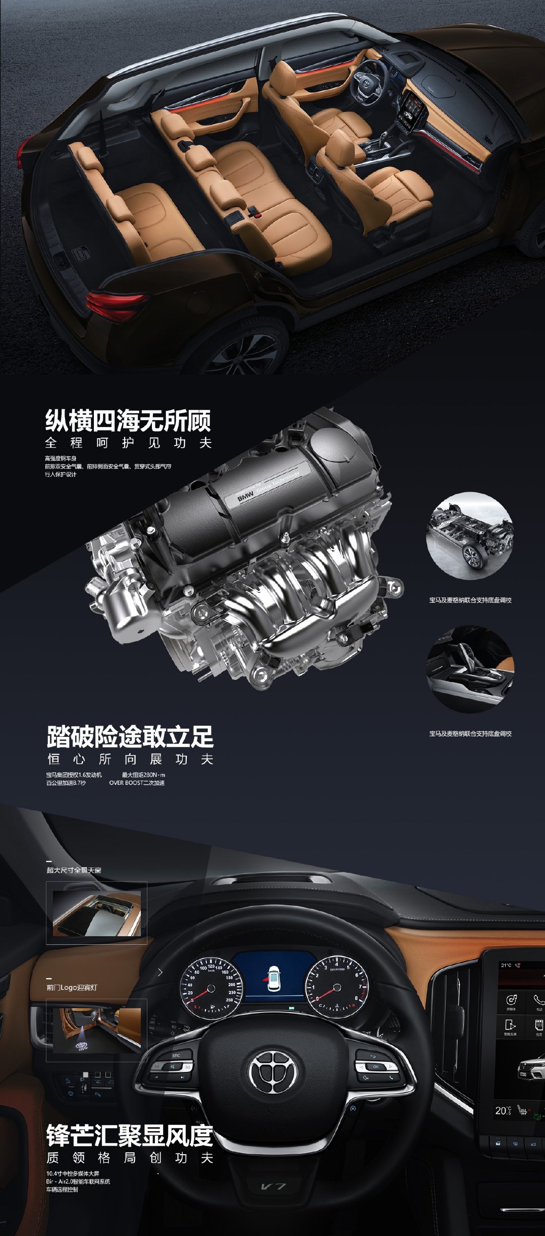 中华V7定位中型SUV,长宽高分别为4702\1932\1753mm,轴距为2770mm,提供5、7座版本。