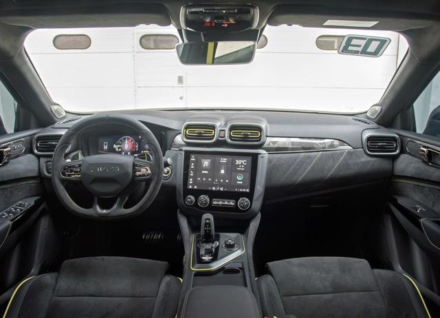 领克03+在内饰方面使用大面积的翻毛皮材质,搭配换挡拨片与运动式一体座椅,营造出强烈的运动氛围,新车甚至于增加迷彩装饰条,副驾驶座椅前方的面板处还有真皮打孔,以突显与普通版本车型的不同,视觉效果确实不负性能之名。