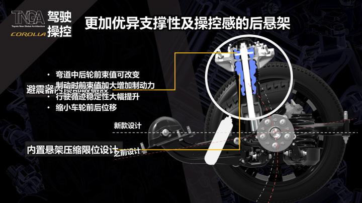底盘方面,为改善前驱车转向不足的问题,全新卡罗拉搭载了同级别前驱独有的ACA弯道转向辅助系统。在转弯过程中,给内侧车轮施加制动力,外侧车轮增加驱动力,改善前轮驱动转向不足的现象。同时后悬架由现款的扭力梁悬架升级为全独立悬架,并且还是同级之中唯一带有纵臂的后独立悬架,提升了车辆操控性和乘坐的舒适性。
