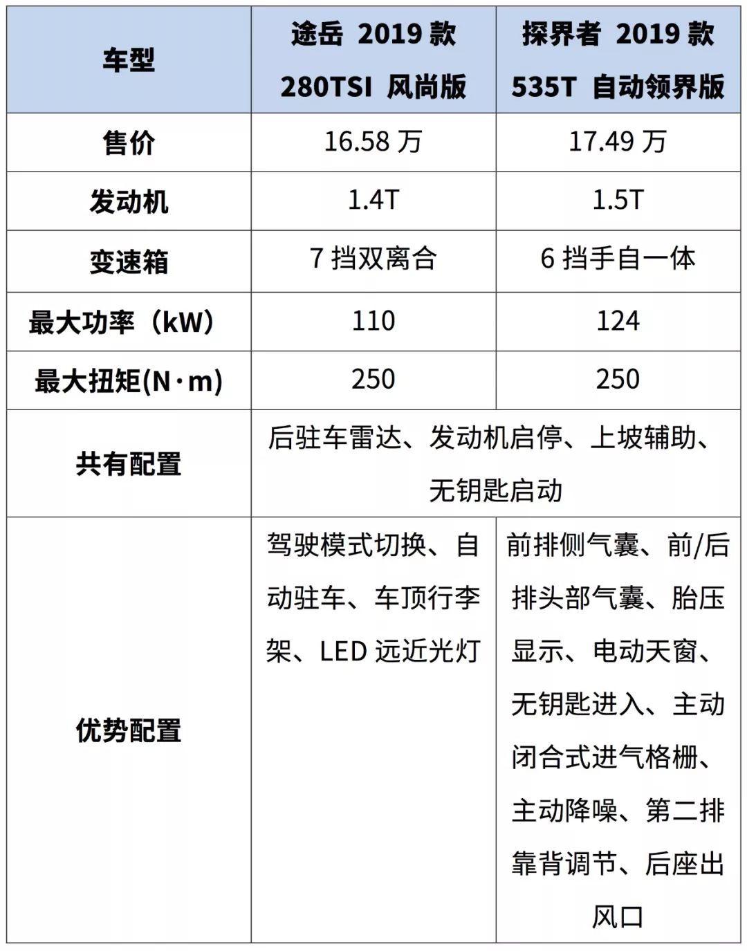 途岳和探界者两款车型定位相近,起步价都不高,甚至和许多中型轿车的起步价定价相近。如果你的预算在20万左右,想找一款性价比较高,空间宽裕,乘坐舒适的大空间五座SUV的话,不妨看看今天的对比,看看它们是否符合你的要求。
