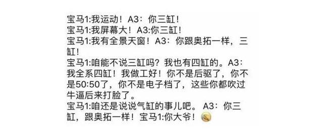 除此之外,一直以来三缸发动机一般是运用在廉价的小型车上,因为其制造成本低,技术水平不高,维护便宜之故,让三缸发动机一直是低端廉价的代名词。比如当初宝马1系换装三缸发动机之时,奥迪A3这个老对手甚至都不肯多做一句文案,句句回怼的都是:你三缸你三缸。