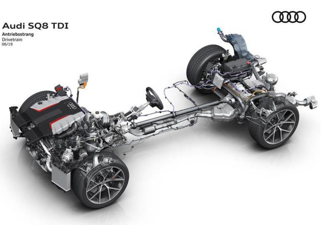 内饰上笔者就不过多的描述,几乎与奥迪Q8相同,主要的变化就是材质上,奥迪SQ8运用了碳纤维和Alcantara进行运动感打造。最后就是最重要的动力总成部分。