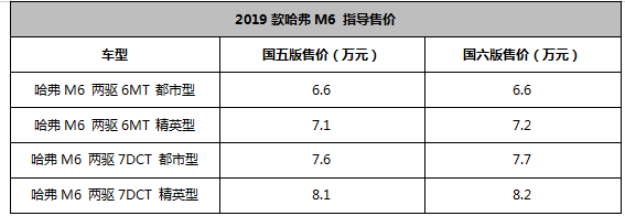 经过最新升级的哈弗M6带来国五、国六两个版本,整体造型焕然一新,这也是本次改款的最大亮点。2019款哈弗M6提供1.5T+6MT和1.5T+7DCT两种动力组合,分为都市型、精英型两种配置,共8款车型,售价区间为6.6万-8.2万元。