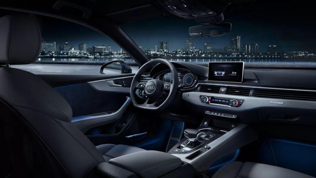 一进入车内奥迪A5 Sportback与A4L如出一辙,同样走的是奥迪家族惯用的高科技路线,三辐式平底式方向盘、全液晶仪表盘、中控台悬浮式液晶屏都有配备。用料上大量搪塑材质和镀铬装饰面板的加入,让车内更有质感,但缺乏豪华感。配置上以我推荐的2019款奥迪A5 Sportback 40 TFSI 时尚型来看,前后排头部气囊、自动驻车、可变悬挂、LED大灯、前/后驻车雷达、电动后备厢、感应雨刷、自动头灯、自动空调等功能均有配备。