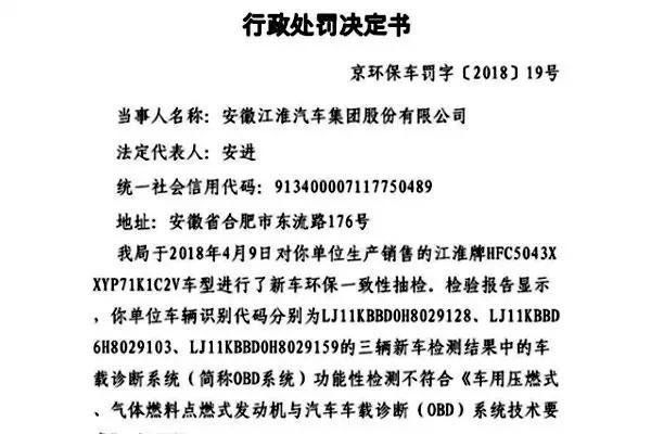 事情在2018年4月9日就已发生,彼时,北京市生态环境局于对江淮汽车生产销售的江淮牌HFC5043XXYP71K1C2V车型进行了新车环保一致性抽检。检验报告显示,江淮汽车识别代码分别为LJ11KBBD0H8029128、LJ11KBBD6H8029103、LJ11KBBD0H8029159的三辆新车检测结果中的车载诊断系统(简称OBD系统)功能性检测不符合《车用压燃式、气体燃料点燃式发动机与汽车车载诊断(OBD)系统技术要求》(HJ4372008)标准要求,属于机动车生产企业对污染控制装置以次充好,冒充排放检验合格产品出厂销售的行为。