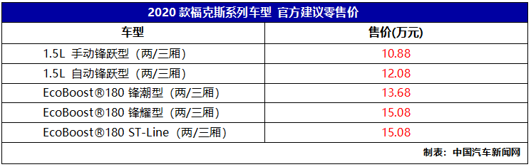 7月11日,长安福特新一代福克斯2020款正式上市,此次上市新车共推出10款车型,包括两厢及三厢版车型,新车相比现款车型在外观、配置及排放方面进行了升级,全系车型均符合国六排放标准。售价区间10.88-15.08万元。