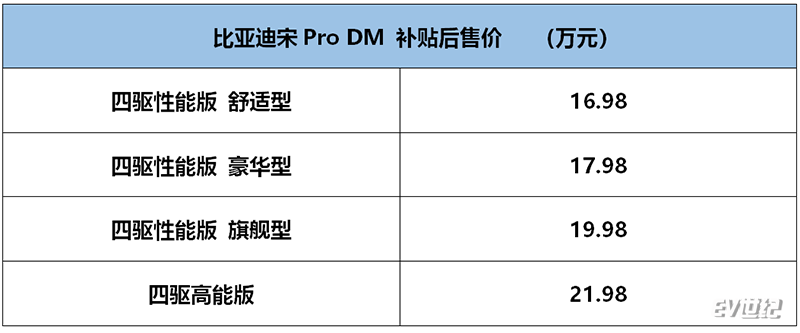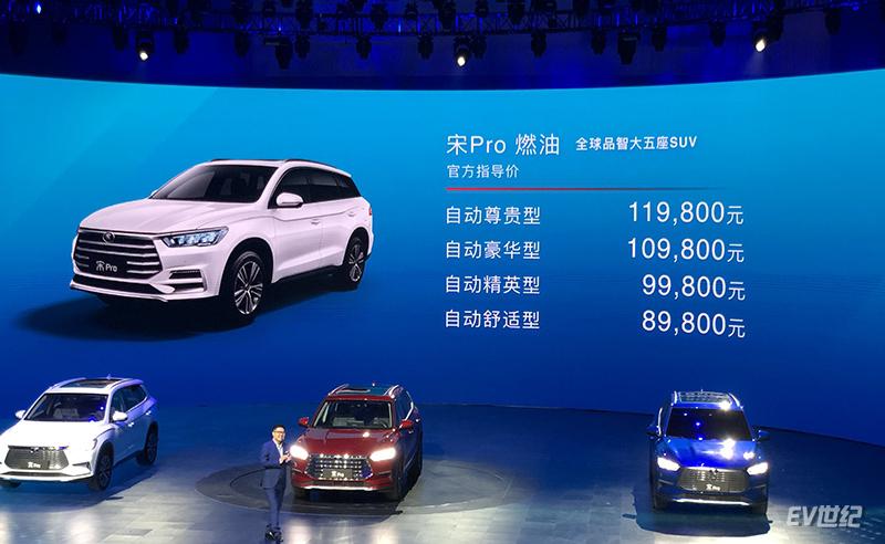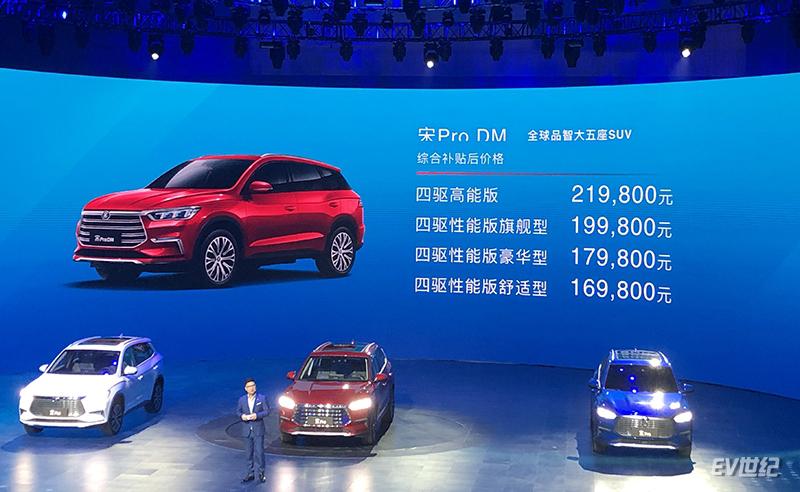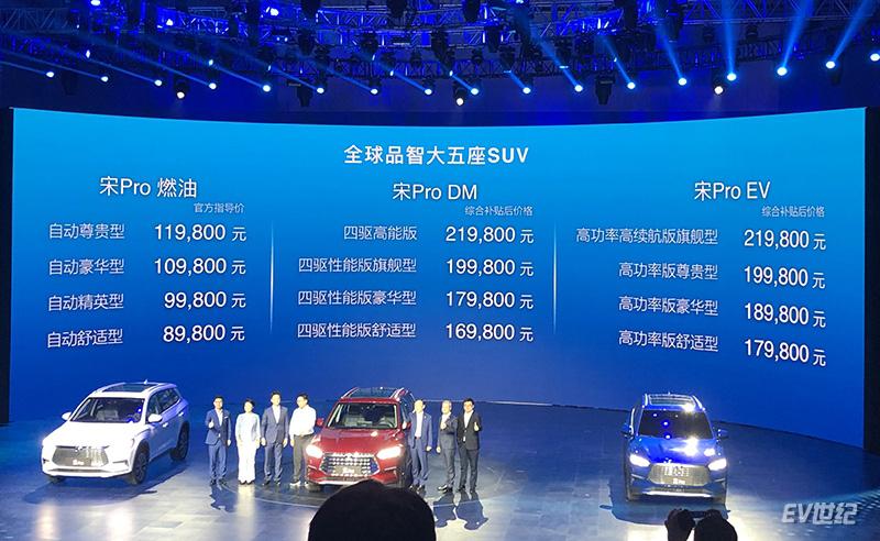 7月11日,比亚迪宋的换代车型——全新宋Pro系列正式上市,新车共有三种不同动力的12款车型,其中:宋Pro燃油版共有四款车型,标配6速DCT双离合变速器,售价8.98-11.98万元;宋Pro DM插电混动共有四款车型,全系标配电四驱,补贴后售价16.98-21.98万元;宋Pro EV纯电动同样有四款车型,综合续航400-502km,补贴后售价17.98-21.98万元。