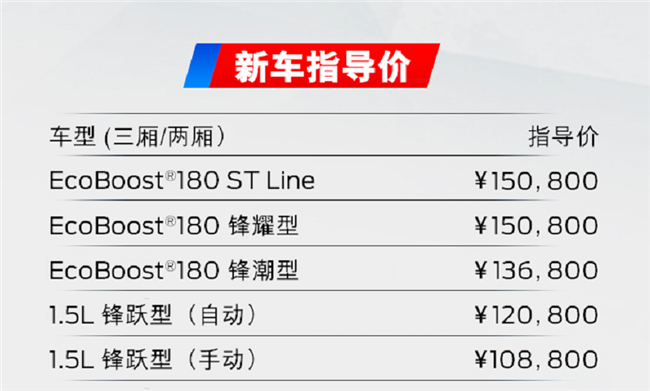 配置方面,EcoBoost180锋潮型和1.5L 自动锋跃型除换装运动套件外,在延续之前配置优势的基础上新增多项实用功能,EcoBoost180锋潮型新增无钥匙进入、一键启动、TPMS胎压监测等,入门级1.5L 自动锋跃型新增大天窗、一键启动、TPMS胎压监测、泊车雷达和皮质方向盘等配置,带来同级最优的产品力和价值感。