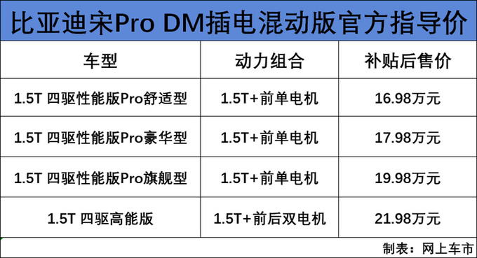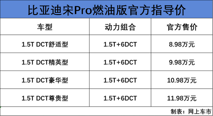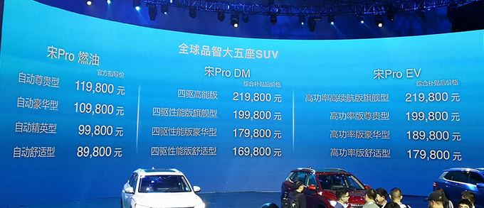 7月11日,比亚迪宋Pro正式上市,新车共推出12款配置车型,其中燃油版4款,售价区间为8.98-11.98万元;插电混动版4款,补贴后官方售价为16.98-21.98万元;纯电动版4款,补贴后官方售价为17.98-21.98万元。宋Pro采用比亚迪家族最新的Dragon Face 2.0设计语言,整体尺寸相比宋得到进一步提升,提供燃油、插电混动以及纯电动三种动力组合。
