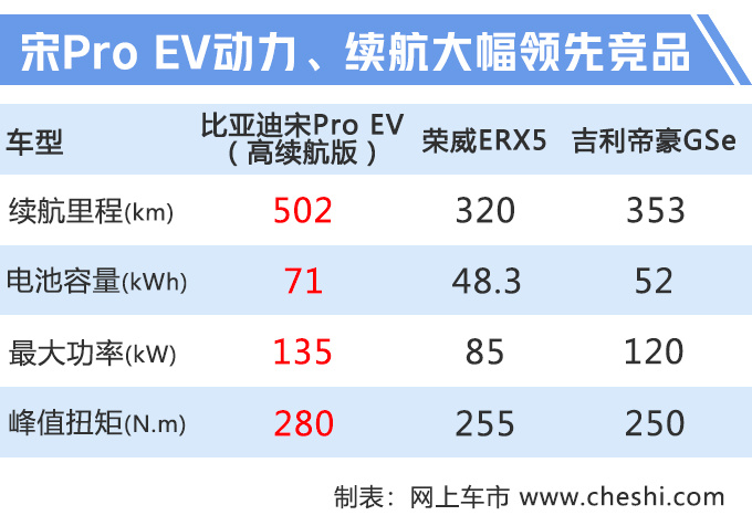 比亚迪宋Pro提供燃油、插电混动(DM)、纯电动(EV)三种版本车型,其中燃油版搭载1.5T发动机,传动系统匹配6MT或6DCT变速箱。DM分为双擎四驱和三擎四驱两个版本车型,其动力、加速表现以及油耗在同级别都拥有绝对优势。EV车型分为高功率和高功率高续航两个版本,NEDC工况续航里程分别为405km、502km,大幅领先荣威ERX5(320km)、帝豪GSe(353km)等同级竞品,充电方面电量从30%充至80%只需30分钟。