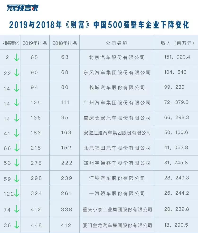 2019年与2018年《财富》中国500强整车企业下降一览表