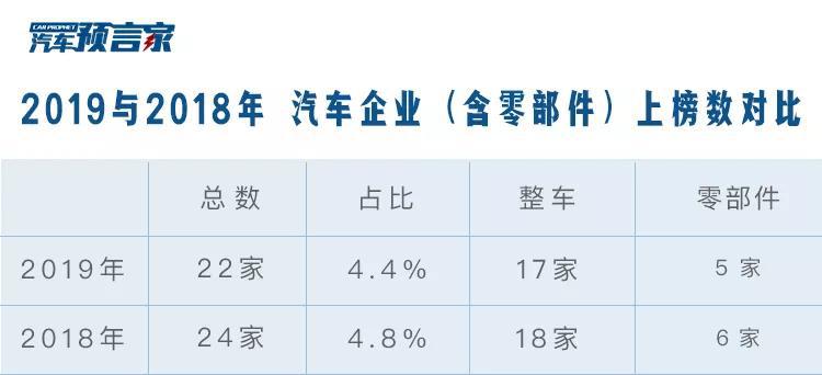 2019与2018年汽车企业(含零部件)上榜数对比