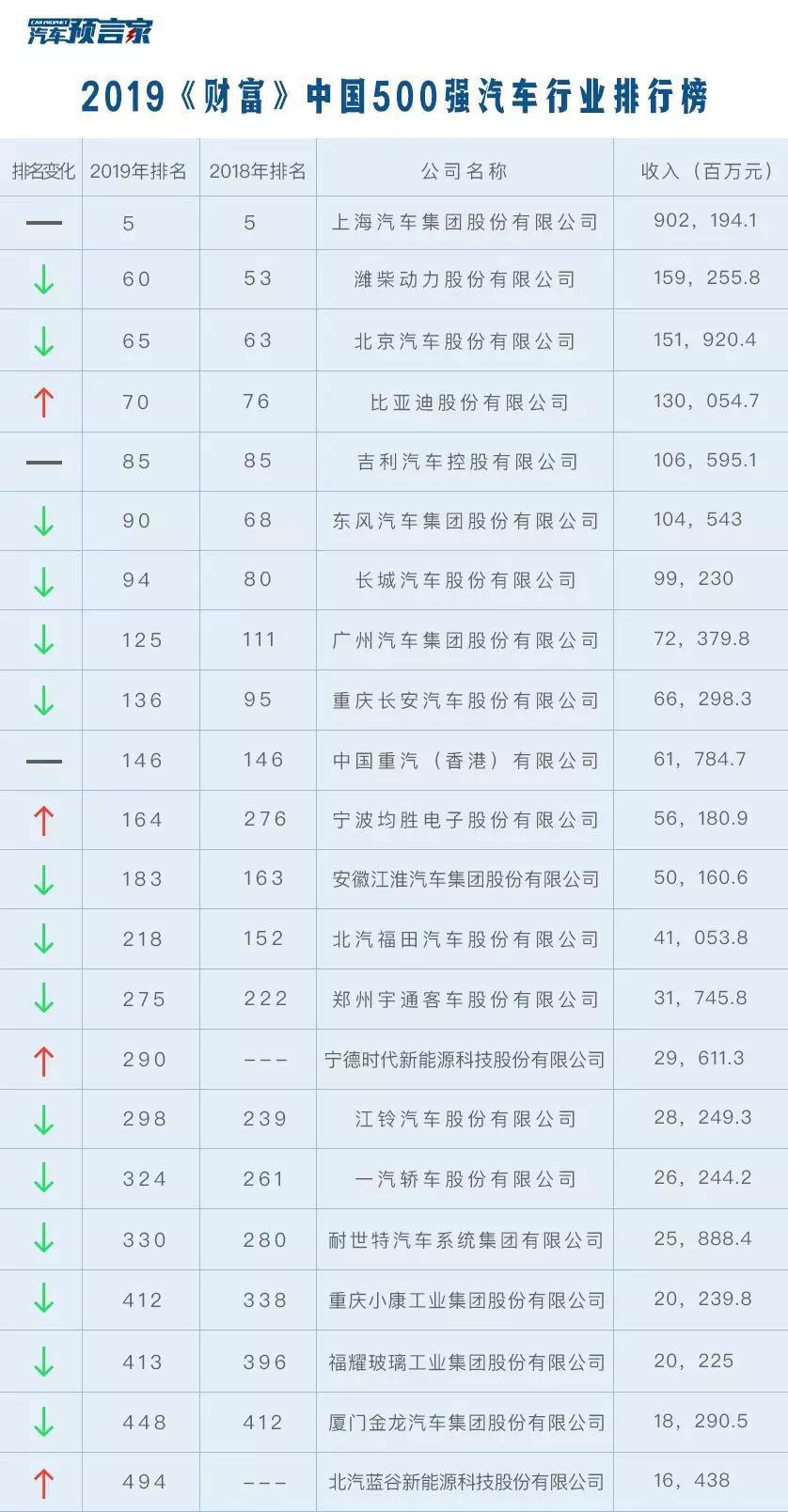 2019《财富》中国500强汽车行业排行榜