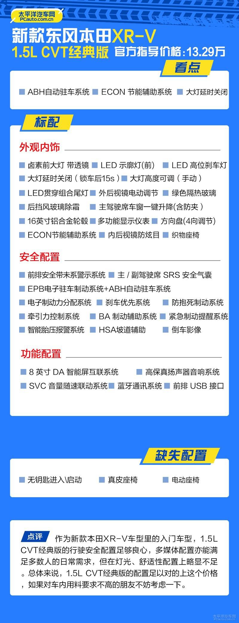 本次改款对于本田XR-V来说,最重要的莫过于新增1.5T发动机,因此在后续的配置分析中,我们着重介绍1.5T版本车型。接下来,我们就先从1.5L CVT经典版来开始解读: