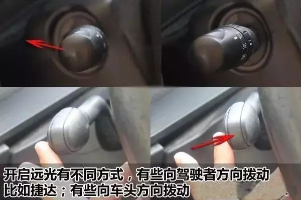 如果照明不佳、无路灯、行驶至路况不熟路段时,请一定开启远光灯;超车时请交替使用远近光灯以示意其他车辆。将车灯杆旋转至上图图示位置可开启近光灯。