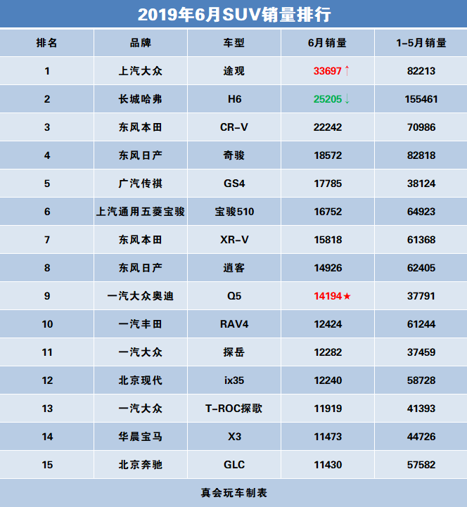 6月SUV销量排行榜第一名:上汽大众途观+途观L