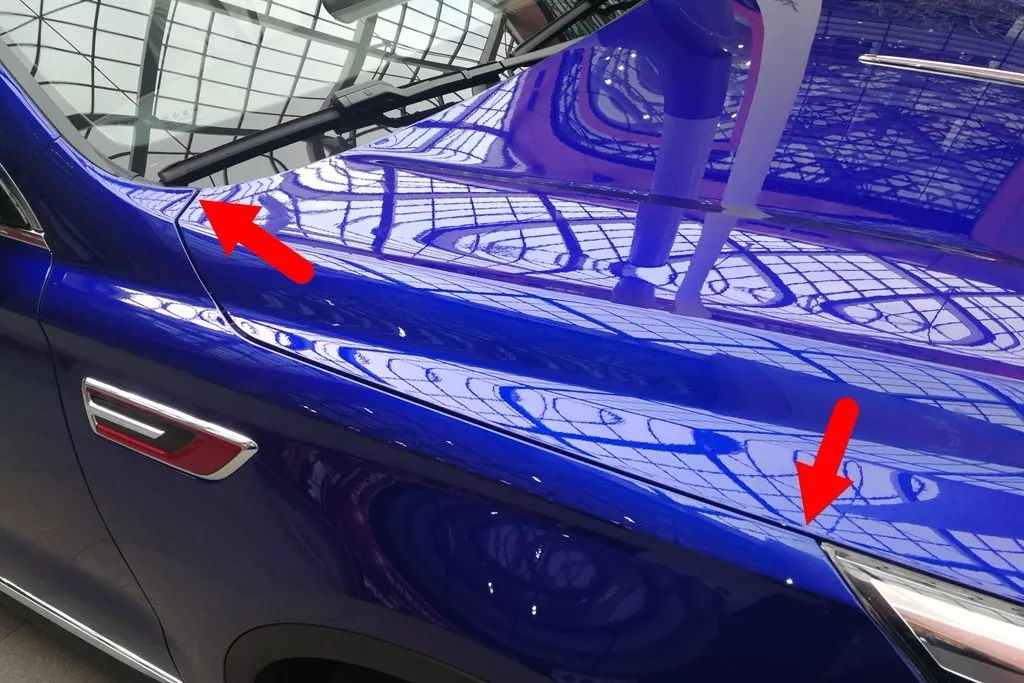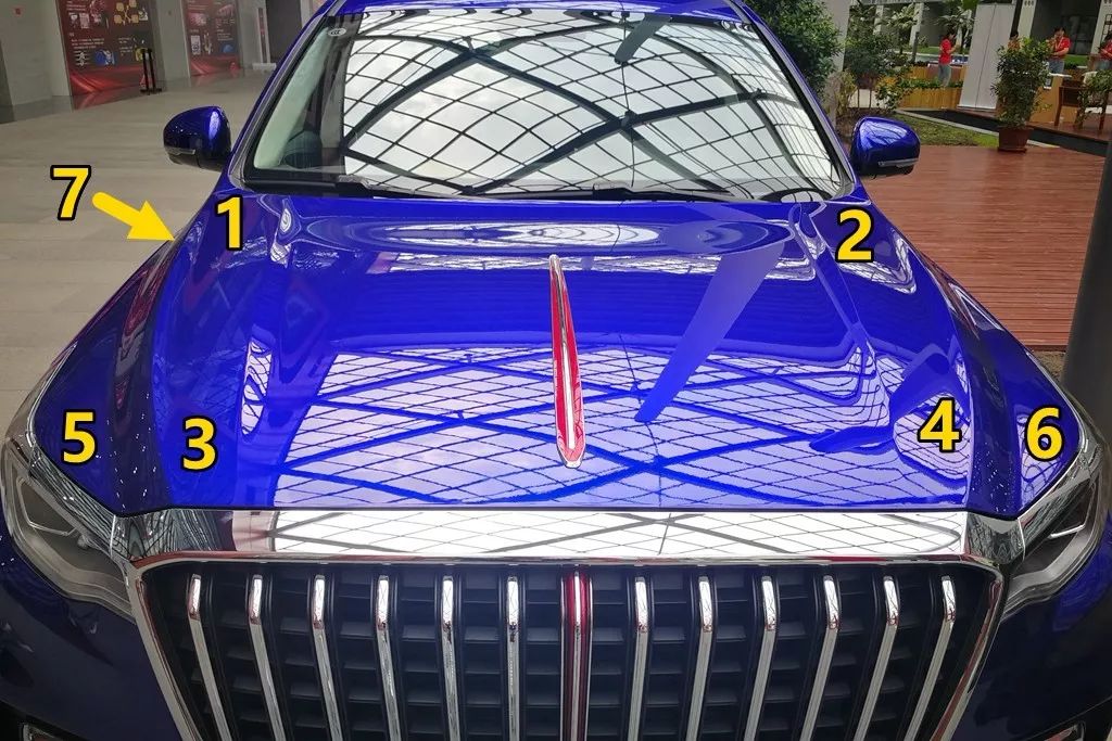 尽管如此,在第7测量点,红旗反而做得很好,此处冲压折面上的落漆并未缩水,这说明红旗针对引擎盖的复杂冲压形面,并不是简单标定一个喷涂面应付了事。从这一点上看,红旗在细节上抠得不错,但在“大方向”上有瑕疵,和奥迪相比还欠点火候。