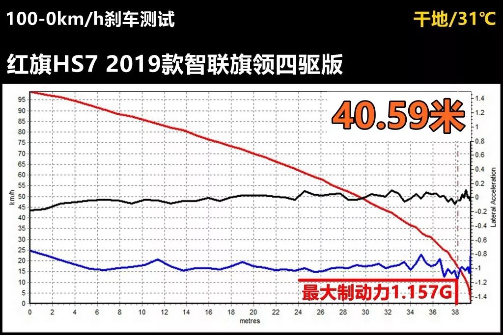 至于100-0km/h刹车测试,40.59米的最短刹车距离出现在第3次测试,5次测试平均成绩则达到了42.63米,5次连续刹车的热衰减率约为5%——这是一种不太理想的情况。从图中不难看出,HS7的最大制动力出现在刹车末端,或许原因就在于此。如此看来红旗的工程师还有得忙。