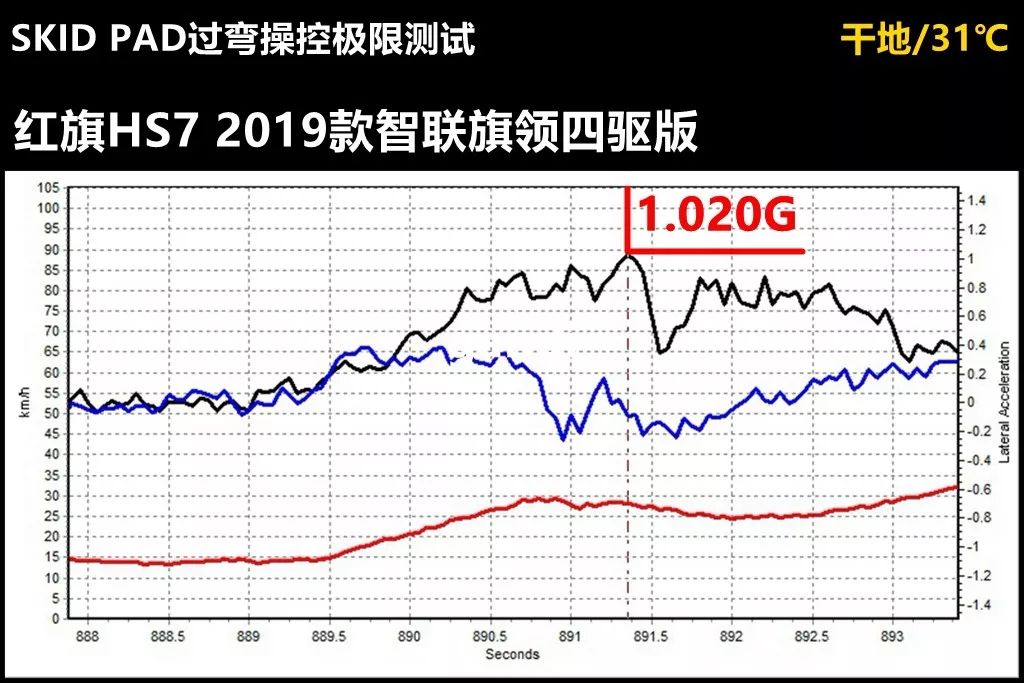 至于操控极限测试,HS7让我们感觉很意外,1.020G的最大操控极限让我们很难相信这是一款自主品牌C级SUV。究其原因,除了疑似奥迪的底盘底子之外,轮胎恐怕也有很大功劳——这是一款255/45R20尺寸的韩泰万途仕(Ventus)S1 EVO2 SUV轮胎,花纹号K117,这是一款主打运动性和干湿地抓地能力的高端运动轮胎。