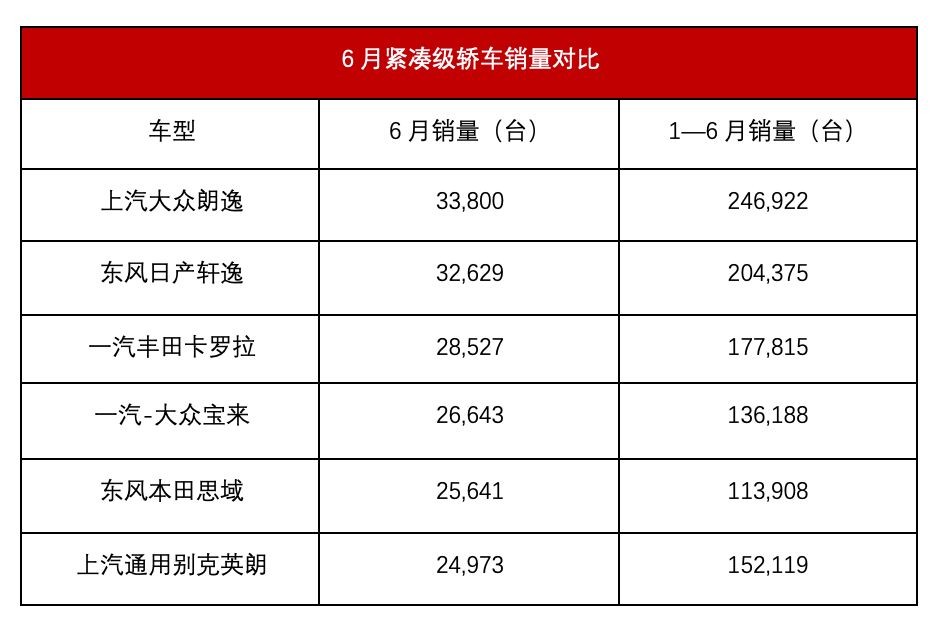 从今年上半年的销量来看,紧凑型轿车市场虽然竞争白热化,但其实分化明显。朗逸和轩逸属于第一梯队,半年销量均超过了20万辆,紧随其后的是卡罗拉和英朗,两者的半年销量均超过了15万台,接下来是宝来和思域,他们的成绩都超过了10万台,而且6月销量均超过2.5万台。