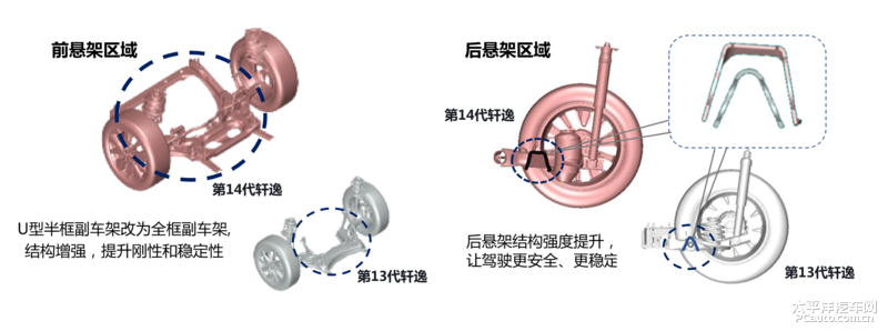 内在处,第14代轩逸车架所采用的超高强度钢比例提升到27.2%,前悬架区域的U型半框结构改为全框副车架,后悬架关键零部件强度也达到加强。又因为车身重心降低,以及转向系统优化了主销后倾拖距和助力曲线,所以新车的操控性和行驶稳定性,都比上一代有了明显进步,开起来不再是一台平淡无奇的家用车。