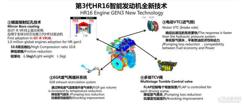 第3代HR16自然吸气发动机相比上一代而言,增加了镜面熔射缸孔、EGR废气再循环、e-VTC电动可变气门正时、TCV多级扰流控制等技术,各项主要性能指标均有所提升。该发动机最大功率为139马力,最大扭矩为169牛·米,在同排量自然吸气发动机中表现优异。另外,工信部油耗低至4.9L/100km,并满足最新的国六排放标准。
