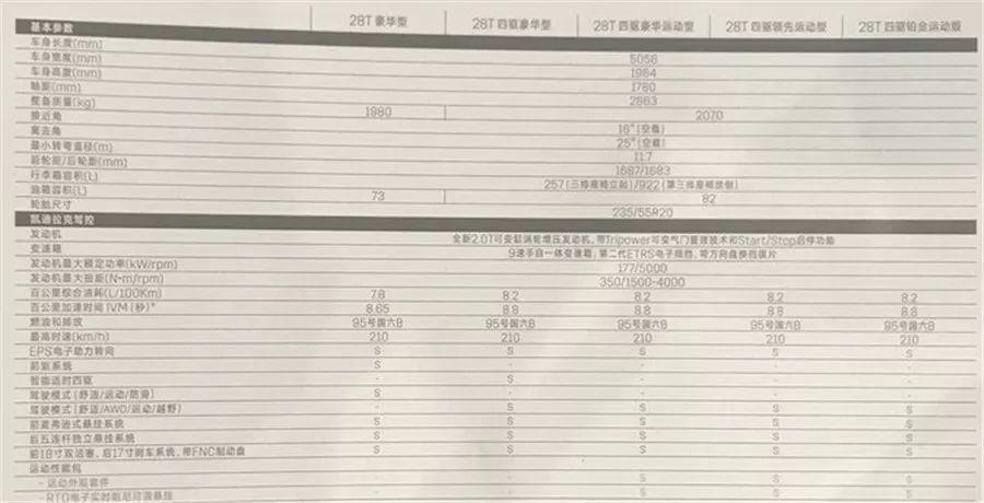 另外网上流传的一份凯迪拉克XT6配置单进一步证实了小智的猜测。从配置单中我们可以看出凯迪拉克XT6预计将会有28T豪华型、28T四驱豪华型、28T四驱豪华运动型、28T四驱领先运动型和28T四驱铂金运动版这5个配置。比较高配的领先型和铂金版都只有运动外观,这和近期上市的中期改款凯迪拉克XT5路子一致,可信度较高。所以凯迪拉克XT6的起步车型应该就是两驱豪华型,并且这也是全系唯一一款两驱车型。