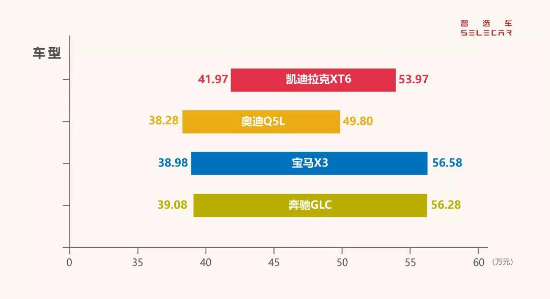 相比较宝马X3、奔驰GLC、奥迪Q5L来说,凯迪拉克XT6的预计售价区间与它们高度重叠。6/7座布局是凯迪拉克XT6的绝对优势,另外更大的车身尺寸、更霸气的外观、更丰富的标准配置也是XT6的强项所在。