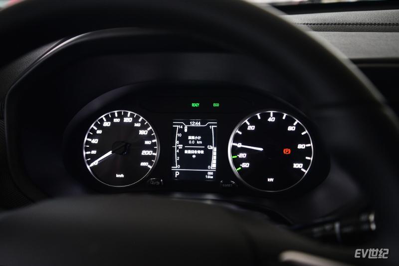 实拍的瑞虎e车型采用了机械+单色液晶屏组成的仪表,左侧为时速显示,右侧为能量输出指示,中部的液晶屏可显示车辆的各种综合信息。