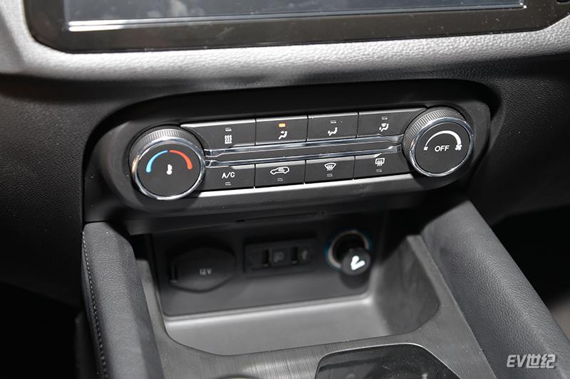 大屏下方是传统的机械按钮空调控制面板,底部还有一个独立的12V电源接口、两个USB接口和一个点烟器。