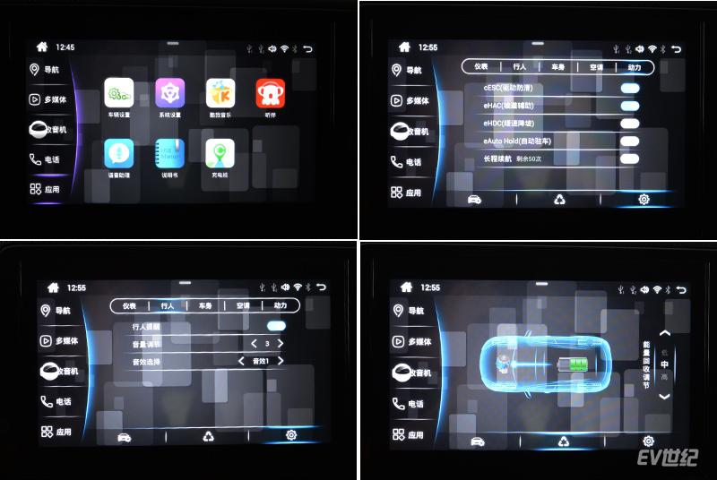 这套智能车机交互系统除了常规的导航、多媒体、蓝牙电话等,还可以支持第三方应用下载、车载Wifi。在车辆相关设置界面内,可以对车辆辅助系统如ESC、HAC、AutoHold、行人警示音等进行设置,另外瑞虎e还有三级的能量回收强度可调。
