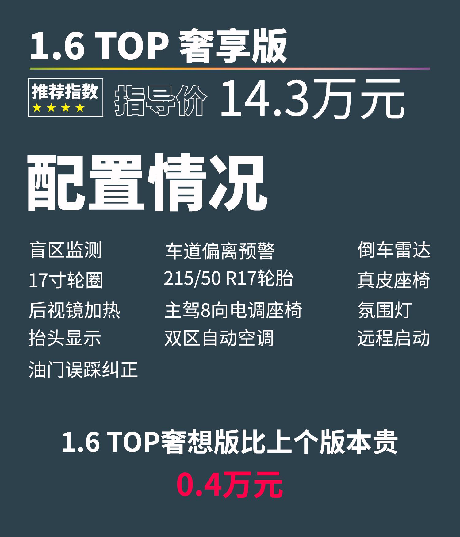 由于多出来的这些配置实用性不高,所以我认为家用的话不如去买1.6 XL悦享版CVT车型(便宜4000元),而1.6 XL智享版的推荐指数只能给到2星。