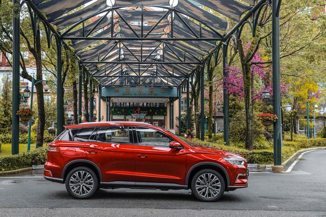车身侧面,宋Pro DM同样运用了大量的运动元素,凌厉飘逸的腰线搭配外凸的轮拱和多辐式的轮毂,营造出了不错的力量感。