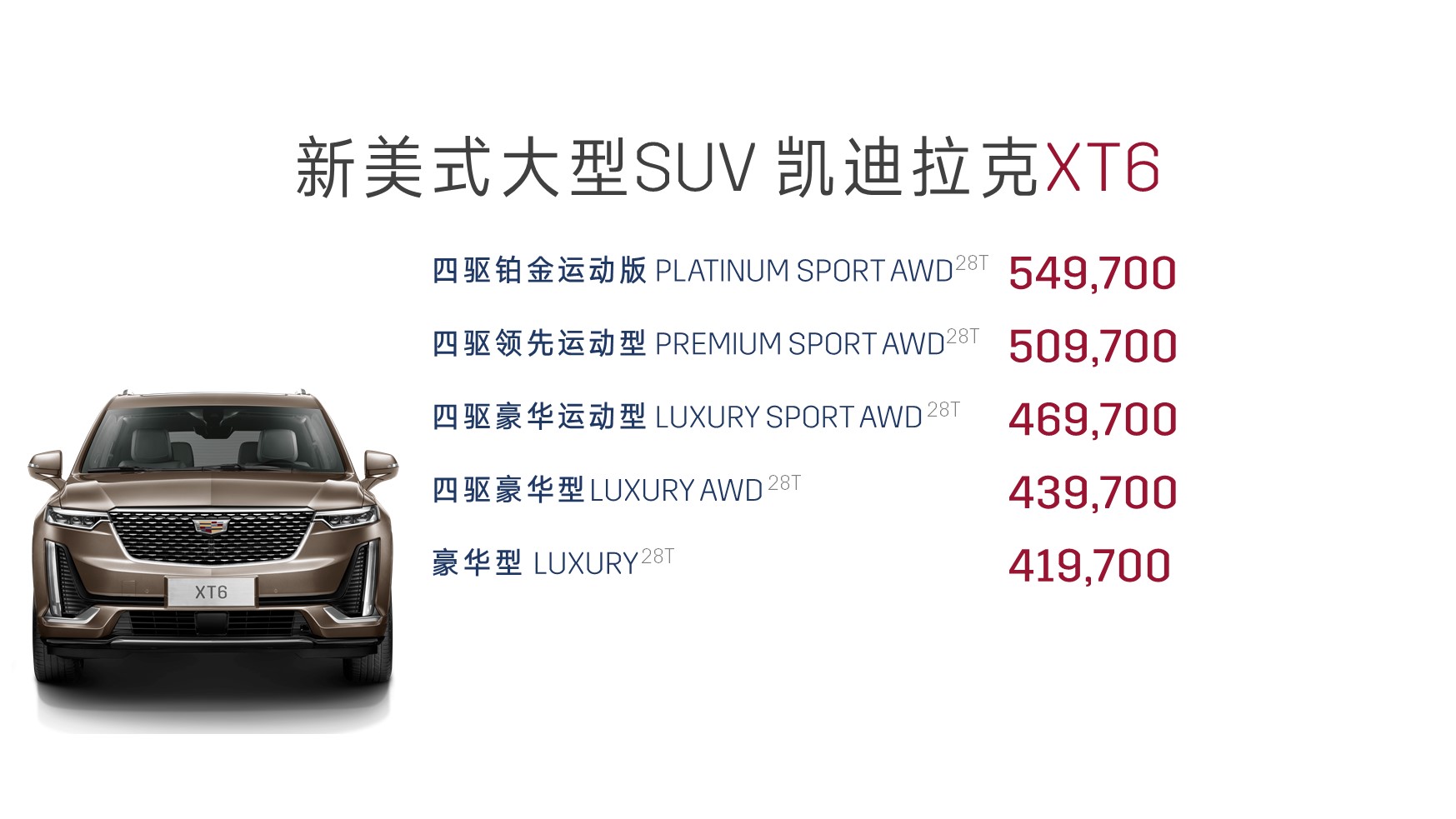 凯迪拉克XT6此次上市的车型全系共分5种不同配置,还提供5种车身颜色和4种内饰颜色选择,售价区间为41.97万至54.97万元。