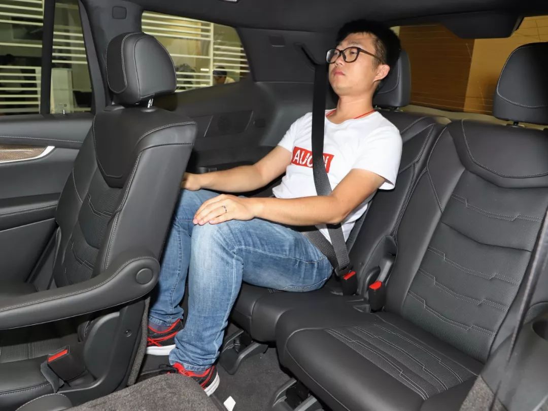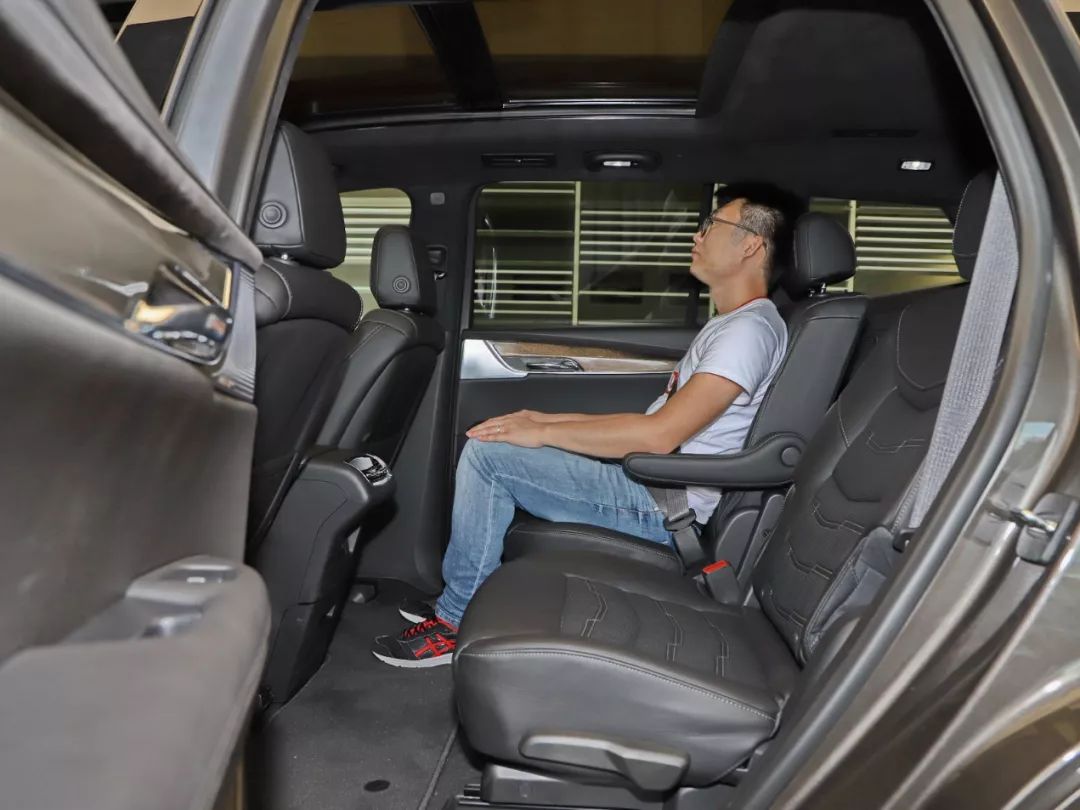 凯迪拉克XT6主推6座版本,若有需要可选装7座布局,根据170cm体验者展示,调整好前排座椅,坐进第二排,头部空间有2拳,膝部空间非常充裕,座椅可前后整体移动,靠背可前后调节,加上中央地板平坦,第二排的整体空间表现良好。但美中不足的是,保持正常坐姿时,坐垫长度较短,大腿前端得不到支撑,略有悬空,长途坐乘会有不适感。