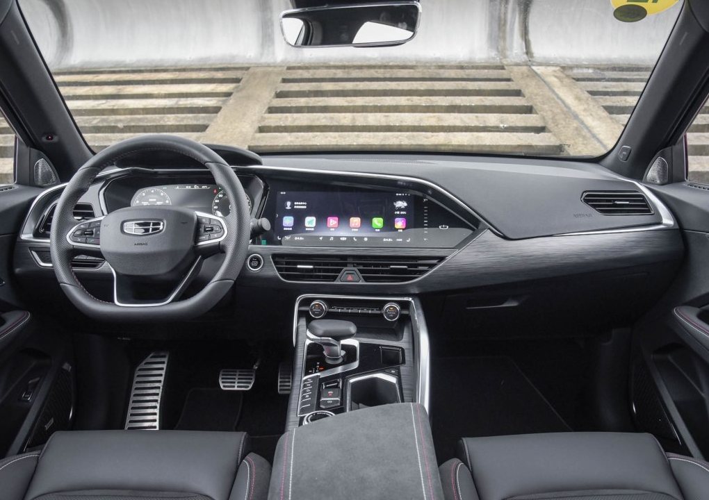 内饰方面,吉利星越同样是采用了吉利品牌全新的内饰风格,运用金属拉丝材质饰板、哑光镀铬饰条与软性搪塑等多种材质组合,以及一块12.3英寸大小的触控液晶屏,营造出了一个具有十足科技感与档次感的驾驶舱。