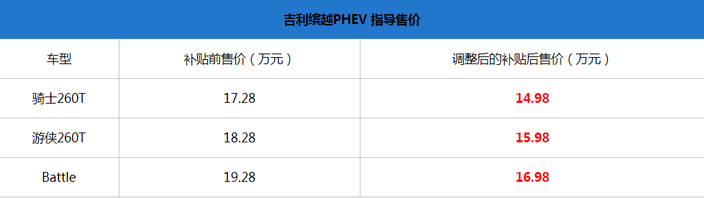 近日,我们从吉利汽车官网获悉,由于国家对新能源车型补贴政策的调整,吉利缤越 (配置|询价)PHEV指导价也做出如下调整:补贴后售价由此前的13.98-15.98万元上调至14.98-16.98万元,整车配置和动力参数并未发生变化。缤越PHEV是吉利BMA模块化架构下首款插电混动SUV,动力方面采用1.5T+7DCT+三元锂电池组成的插电式混动系统,纯电综合续航62km,官方0-100km/h加速时间仅为6.9秒。